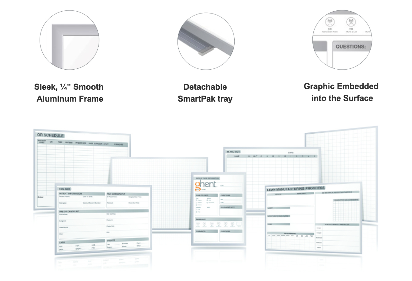Ghent is excited to introduce our line of Graphic Dry Erase Boards! Our Graphic Dry Erase Boards were designed to match any interior. We researched the designs used on our whiteboards to facilitate communication specifically in healthcare and manufacturing settings. Whether you need to communicate patient information and schedules in your healthcare facility, keep track of LEAN initiatives or employees, or just need a simpler way to showcase graphs and charts, Ghent Graphics Whiteboards have a solution for you! All boards feature: