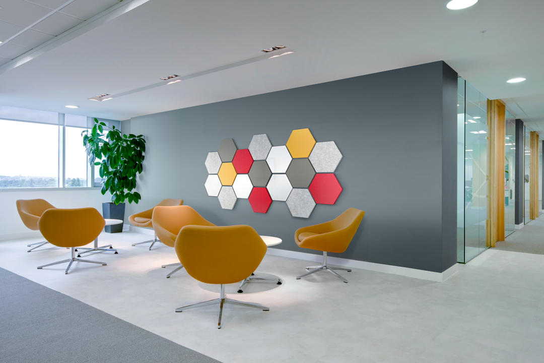 Quiet Down in Style Another option is the Acoustic Hex from Ghent. The acoustic panel surface lessen sound in a noisy office and is available in 7 standard colors. Designed to make common areas uncommon, Hex acoustic boards combine an exciting shape with a variety of colors to add some excitement to an office, conference room or co-working area. Hex is the perfect dimensional board that draws attention to an otherwise ordinary space. Hang Hex with the flat or pointed side upward, side by side to create modular designs–and mix and match colors and surfaces to create a unique canvas of functional artwork.
