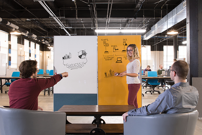 So, extend this approach to the office setting. Maybe an employee struggling with maintaining attention could use moveable walls to create a closed-in space in an open office. Or another employee battling back pain could use a desk that can alternate between standing and sitting to help combat back stiffness. An employee with anxiety might appreciate a white noise system to muffle conversations. Including whiteboards scattered across an office can help visual learners communicate.