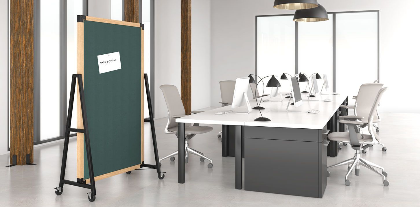 First up: Stroll. Many of our clients use this mobile glassboard to encourage brainstorming sessions throughout the office. With heavy-duty, locking casters, Stroll can transition from a carpeted room to a tiled room with no difficulty. That means if you need to move it from a conference room to an active workspace, this is the piece for you. On top of being a tool for communication, the acoustic buffering can also dampen noise in a room or even create a barrier to divide rooms.