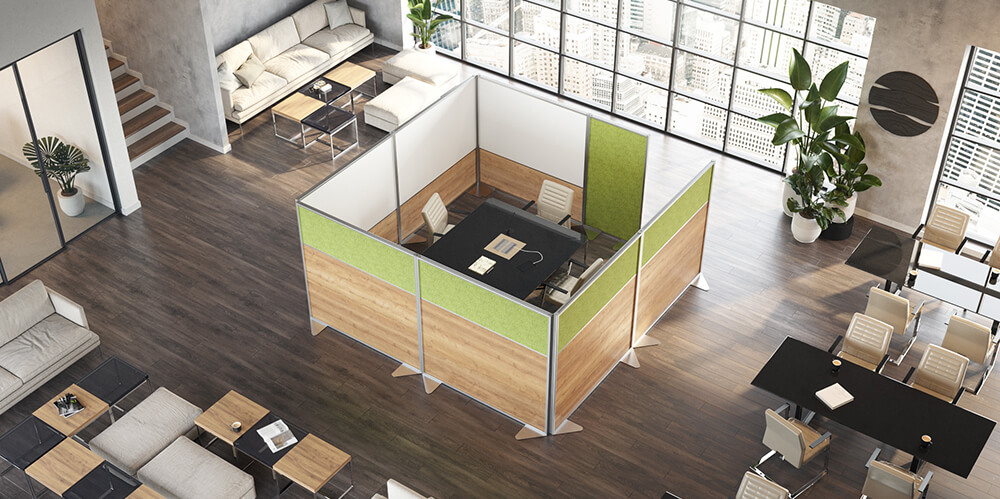 Floor Partitions are the quintessential example of a truly configurable office addition. Converting any space into a collaboration zone, Floor Partitions were created with privacy and collective brainstorming in mind. Functioning as a “third space”, this lightweight partition can be chosen to have 1-3 panels per partition, and has the option of whiteboard, acoustic PET, tackable vinyl or cork to ensure that whether you’re working individually or together, the space you create with these partitions serves you in more ways than one. Their modular design creates ease with set up and tear down, making them simple to travel with and sturdy enough to last.