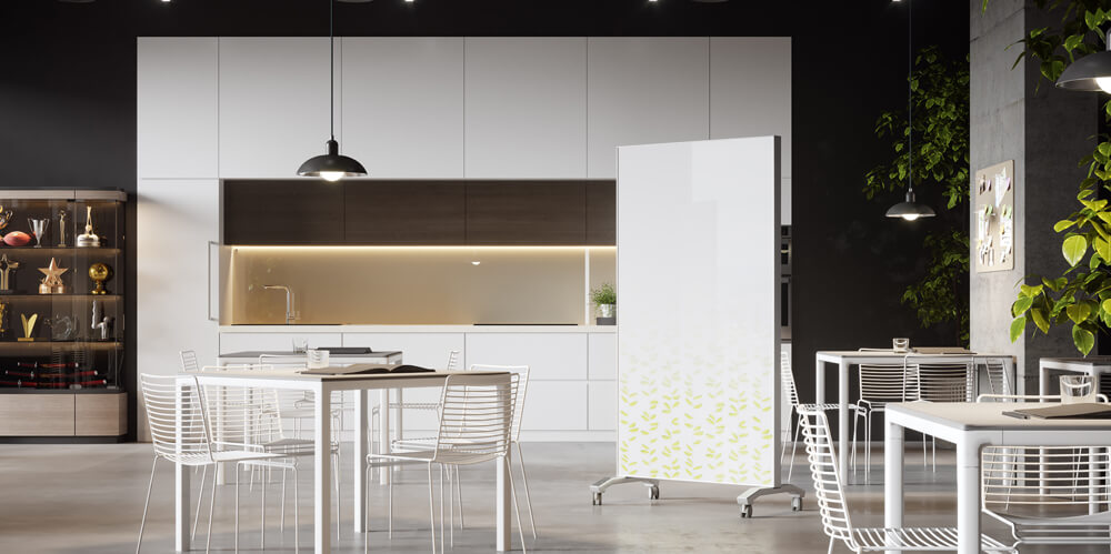 Our Stroll Mobile Glassboards are a multi-purpose and fully customizable option for your workspace. Set on wheels, Stroll Mobile allows you to take your ideas on the go, which comes in particularly handy if you have an open office space without ample writing surfaces.. You can utilize a single glassboard, or line up multiple boards to create space division and functionality that meets your needs. The glass comes in 18 standard colors, but if you are in search of a more unique option, we can create custom colors for you. A full acoustic fabric panel is also available, and able to be made in one of 6 standard colors or you can use custom fabrics – choose from Maharam or Guilford of Maine brands. Stroll also comes in multiple sizes, including a T-base option that is designed to separate workspaces while offering the full functions of our mobile glassboards.