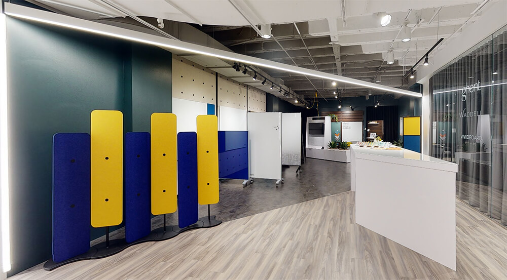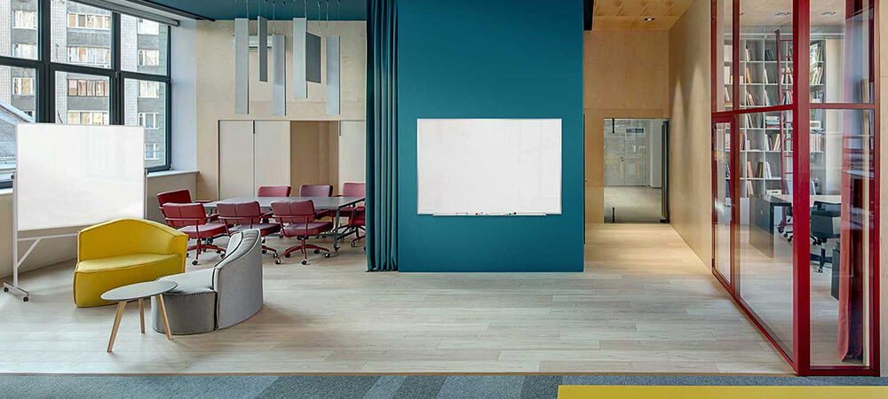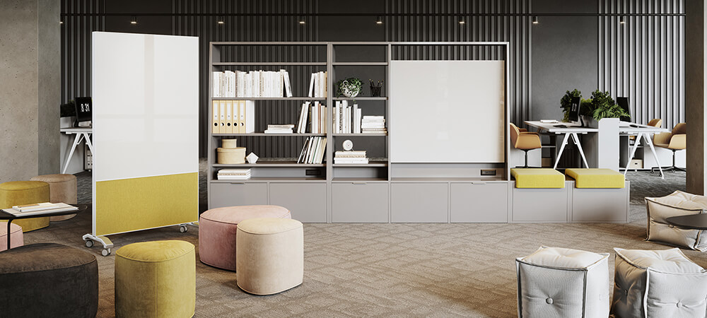 Stroll Mobile Glassboard: Create on the go with Stroll, a mobile glassboard that allows you to use one board on its own, or line up multiple to double as a space partition. Stroll also offers the option to integrate acoustic buffering or tackable surfaces on your board.