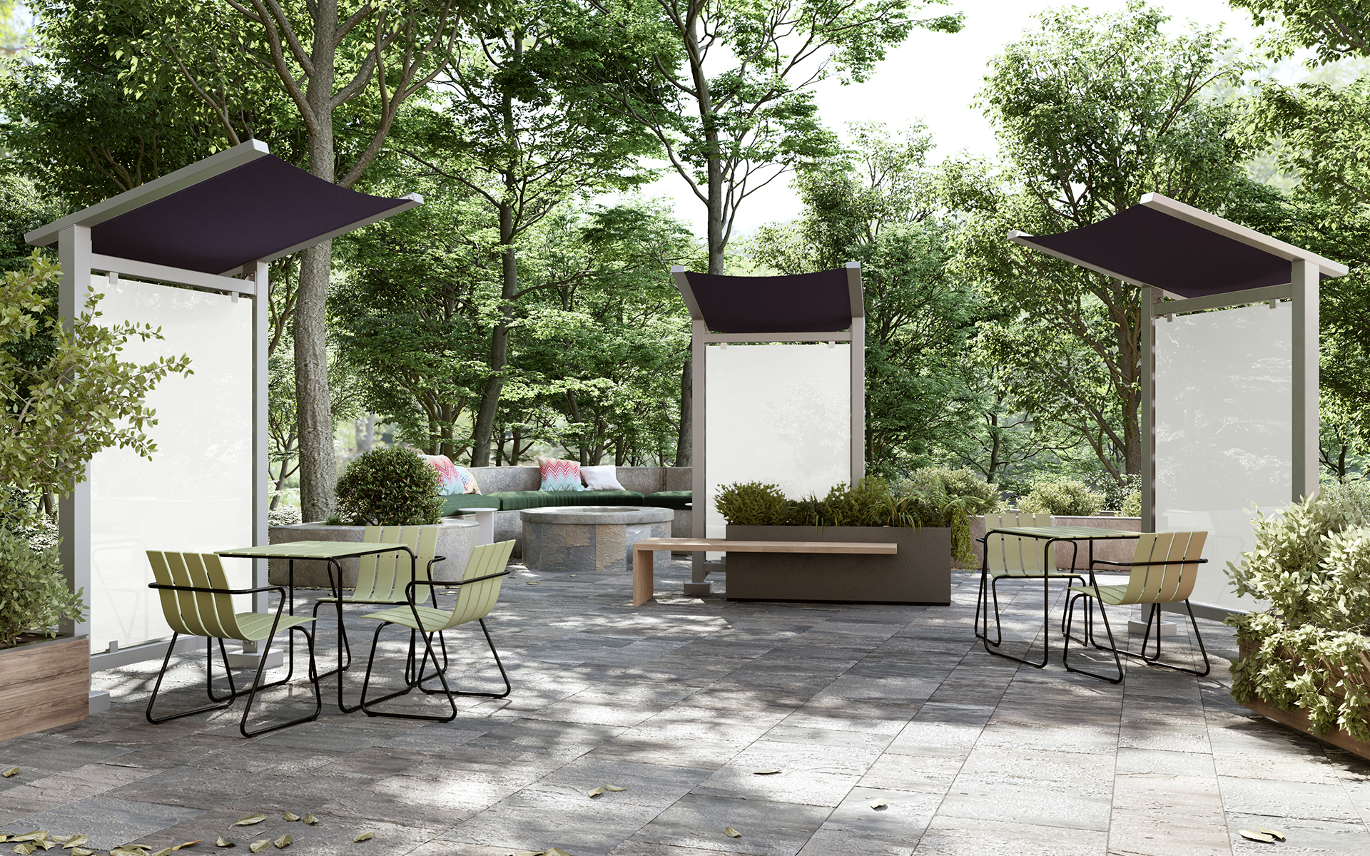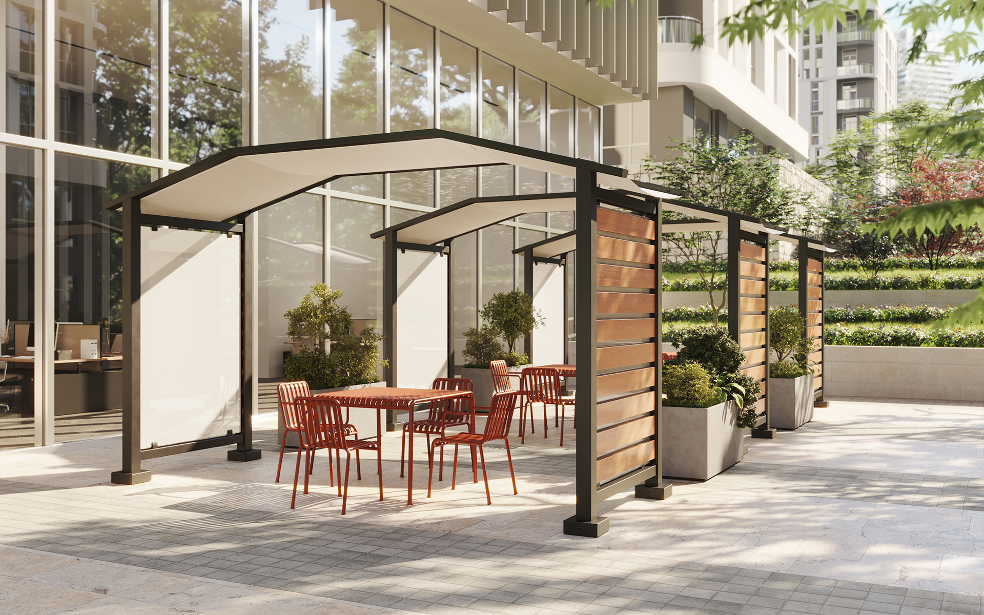 Inspired by nature and wellness, Preserve will help free your mind to think outside the walls. Featuring weather-tested glass, steel, and fabric, Preserve is built to withstand the elements and create an outdoor space that is an extension of the indoors. Reinforced steel columns combined with a horizontally mounted ½" thick laminated and tempered glassboard, and an awning defines an outdoor meeting space and ensures durability.