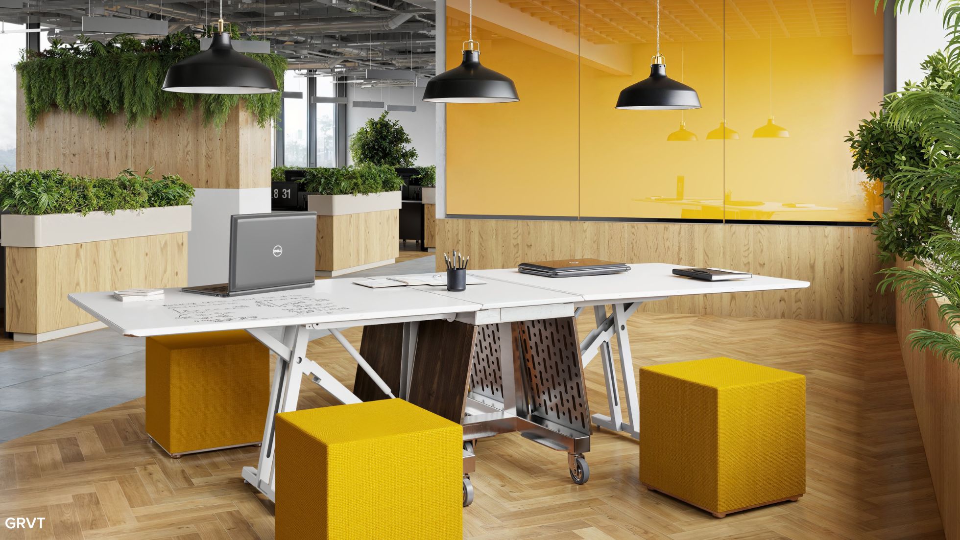 Ghent recommends GRVT® for a flexible and functional work environment. GRVT® is a mobile collaboration hub that accommodates sit-down and stand-up collaborations. GRVT® can be used inside and outside, providing a one-stop shop for flexible working environments.
