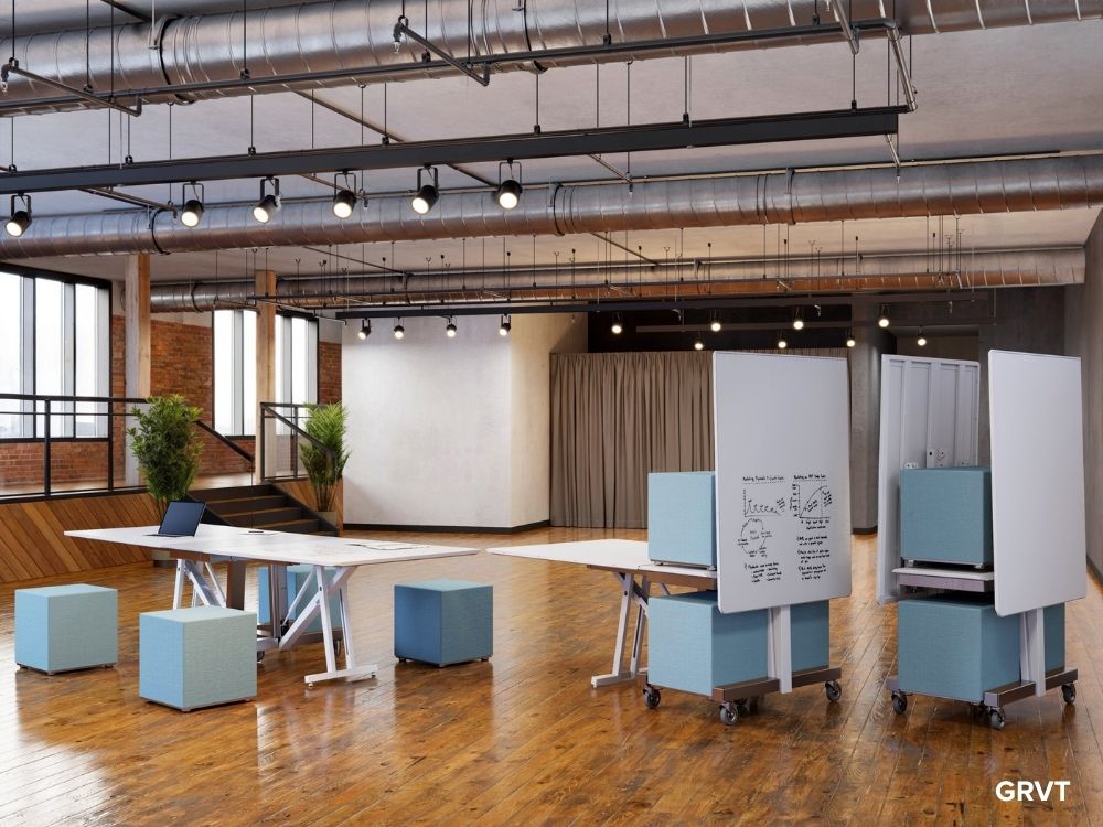 With Ghent's headquarters in Lebanon, Ohio, we're no stranger to rapidly changing weather. GRVT is perfect for collaboration whenever and wherever. This mobile hub is fitted with a collapsible glassboard and four customizable poufs that are made for both indoor and outdoor environments.
