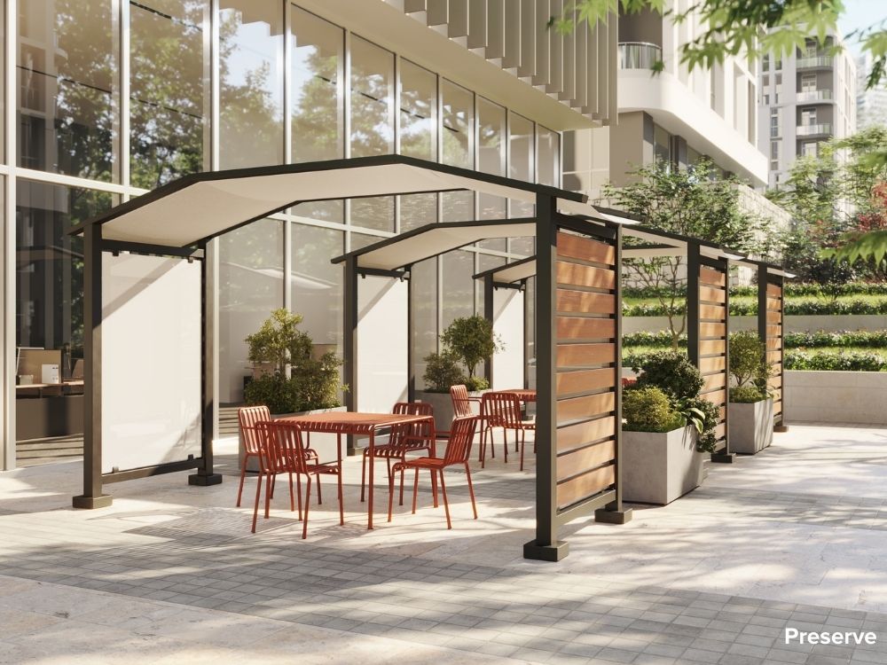 Preserve is a fixed outdoor whiteboard and the perfect place to let your ideas grow. Inspired by nature and wellness, it features tested glass, steel, and fabric. Preserve is the perfect meeting space to collaborate beyond four walls.