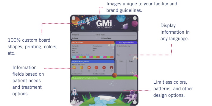 Studies have shown that including a patient room board leads to an improved experience. For inpatient care, havingthe attending physician and nurse, medication schedule, and goals for care written can improve patient satisfaction with communication. This can help put a parent’s mind at ease and focus on their child.