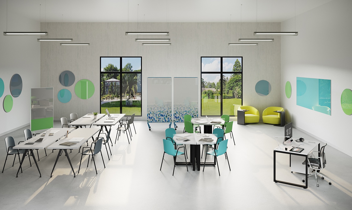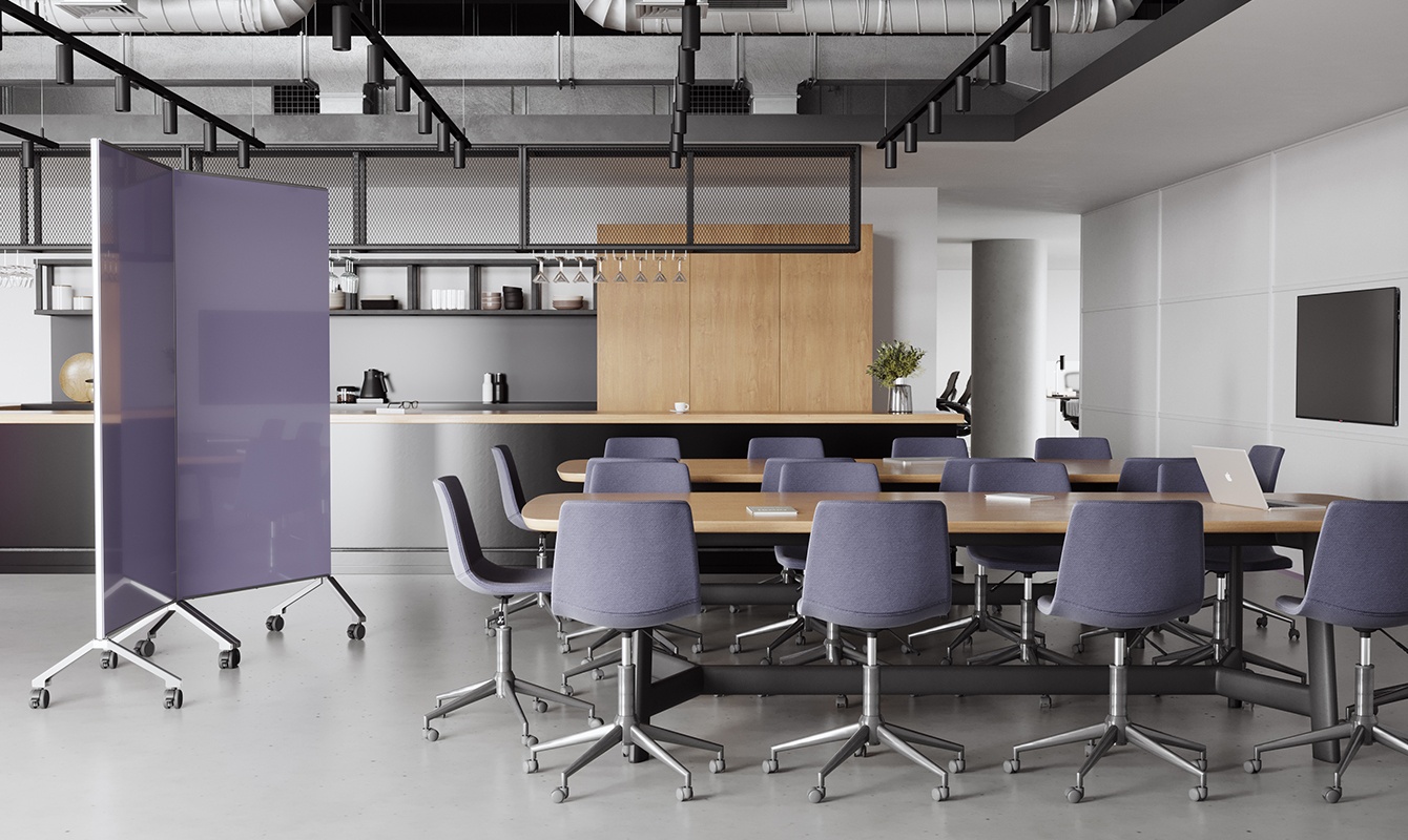 A multi-functional mobile glassboard that can be used for free-roaming or space dividing partitions.