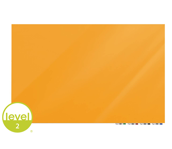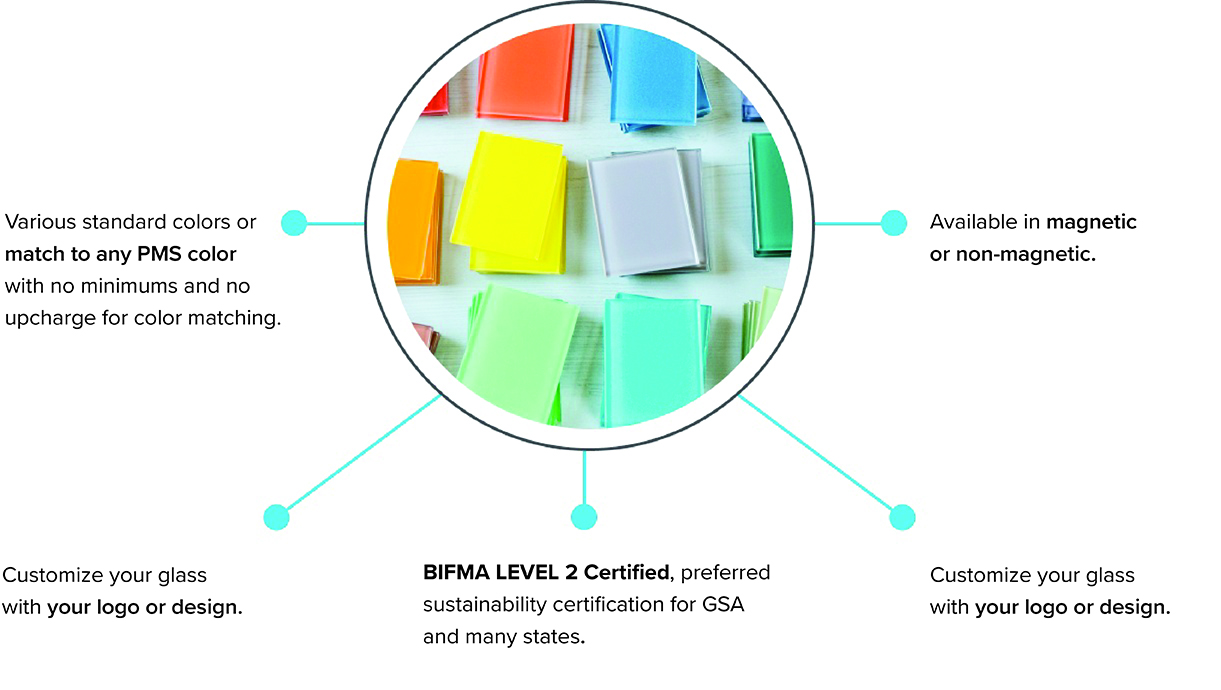 The first glassboard certified LEVEL® 2 from BIFMA. Offered with square or round corners accompanied by matching polished silver standoffs.