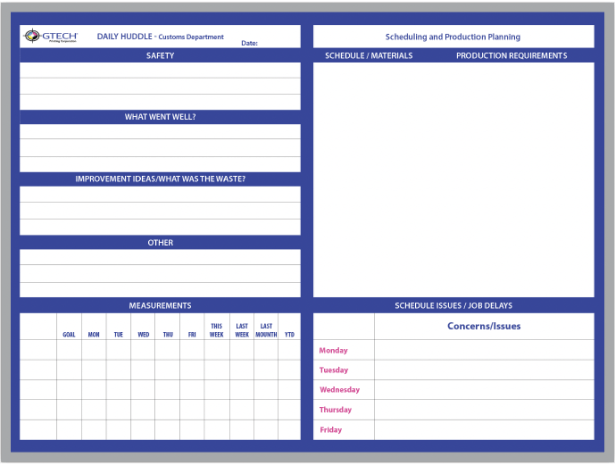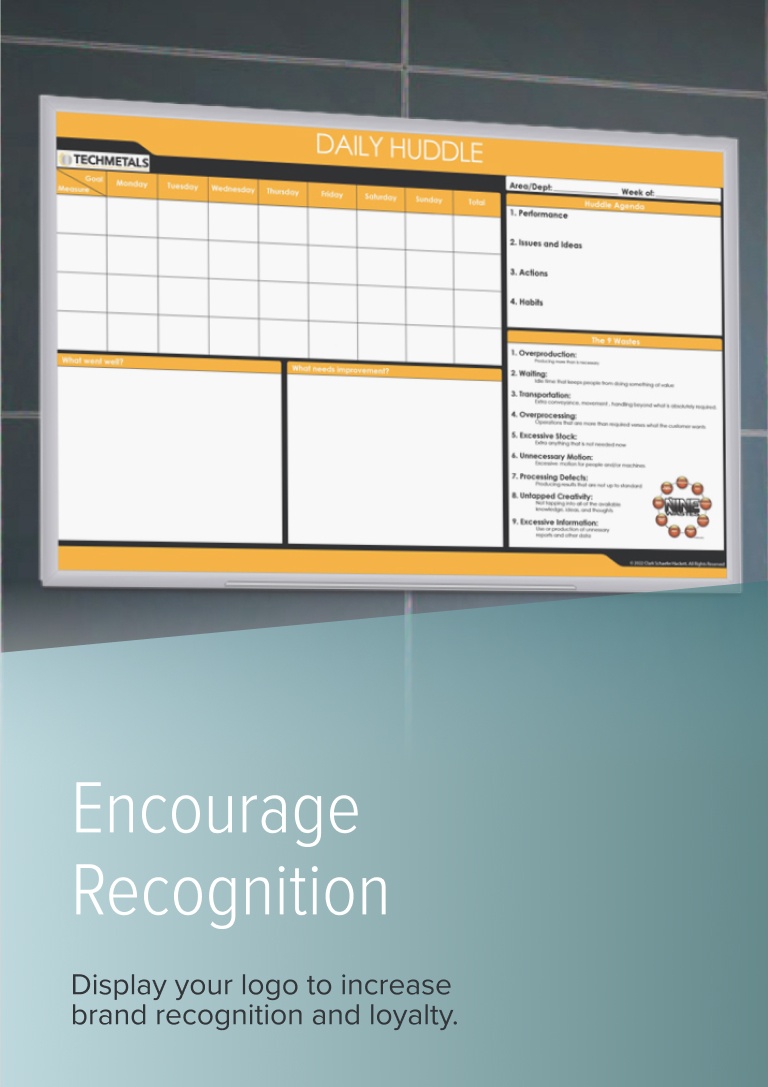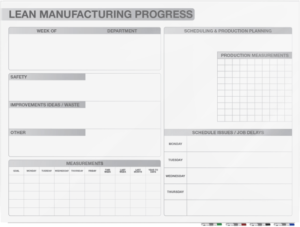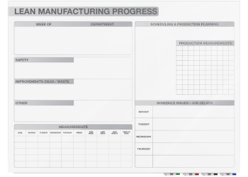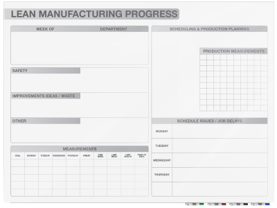 Track LEAN initiatives and progress that can be used anywhere in your facility. The graphics on our erasable boards are specially designed to encourage communication between managers and employees by providing an easy way to exchange information.
